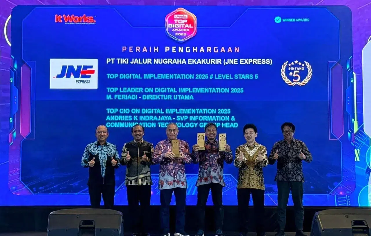 JNE berhasil meraih tiga kategori penghargaan, yaitu TOP Digital Implementation 2025 # Stars 5 (Kategori Tertinggi), TOP Leader on Digital Implementation 2025 yang diberikan kepada M. Feriadi Soeprapto selaku Presiden Direktur JNE, dan TOP CIO on Digital Implementation 2025 yang diberikan kepada Andries K. Indrajaya selaku SVP Information & Communication Technology Group Head.